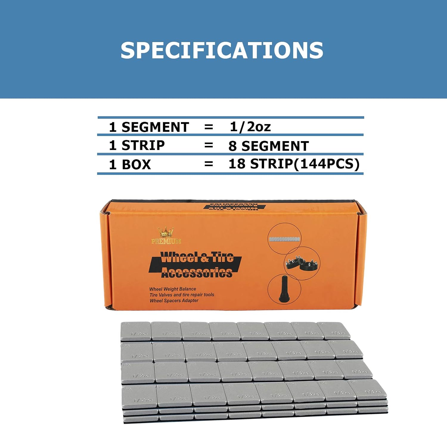 - Specification: Gray wheel weights,1/2 oz per segment, 8 segments per strip, 18 strips per box. Total weight = 72 oz(4.5 LBS). Precision segments perform an accurate balance