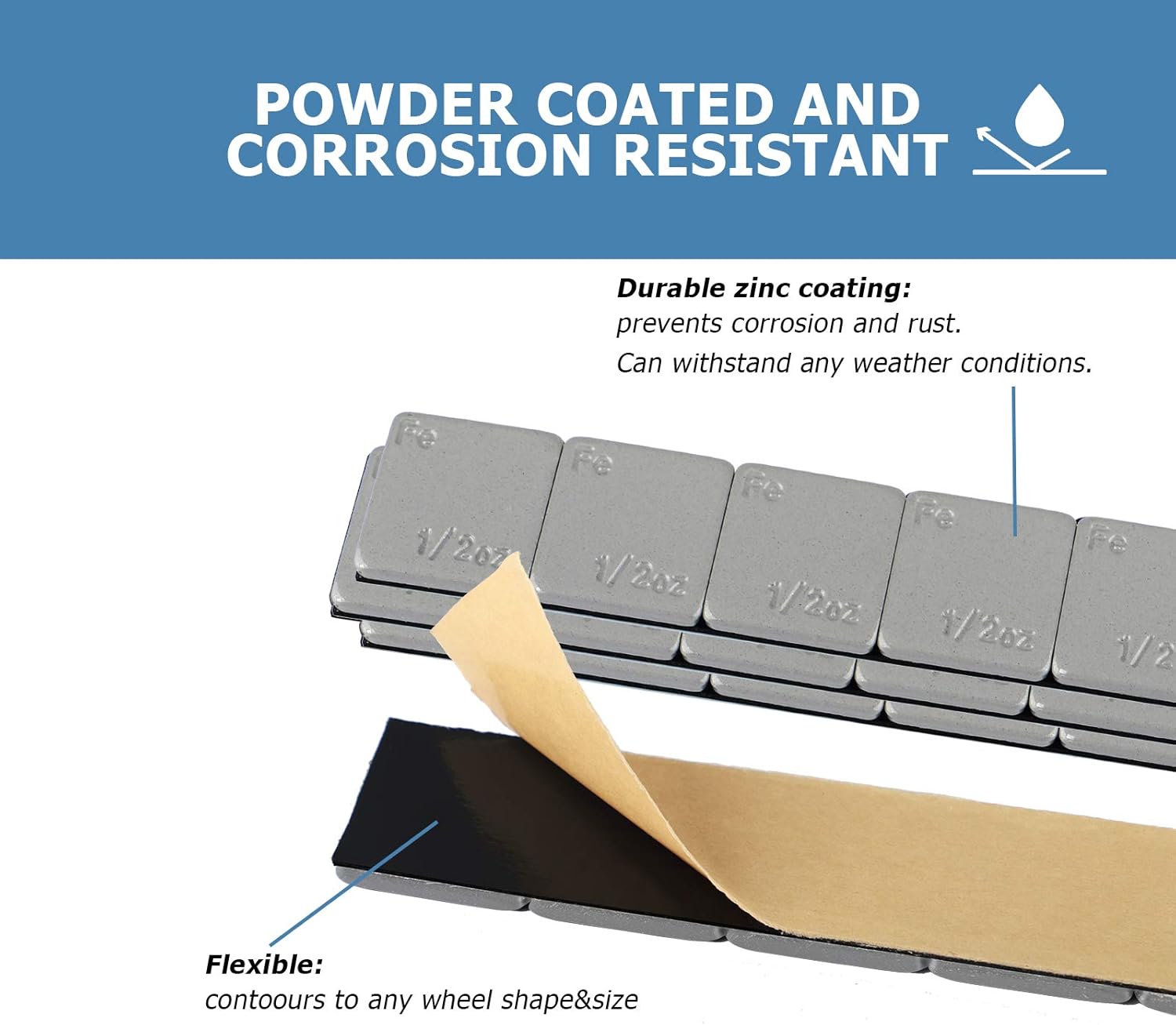 - High quality for durability: The balance are treated with a powder coating to prevent corrosion and rust, and can withstand any weather conditions your car normally experiences. Meanwhile, our wheel weights feature rounded corner stamping to easily contouring any wheel shape and size