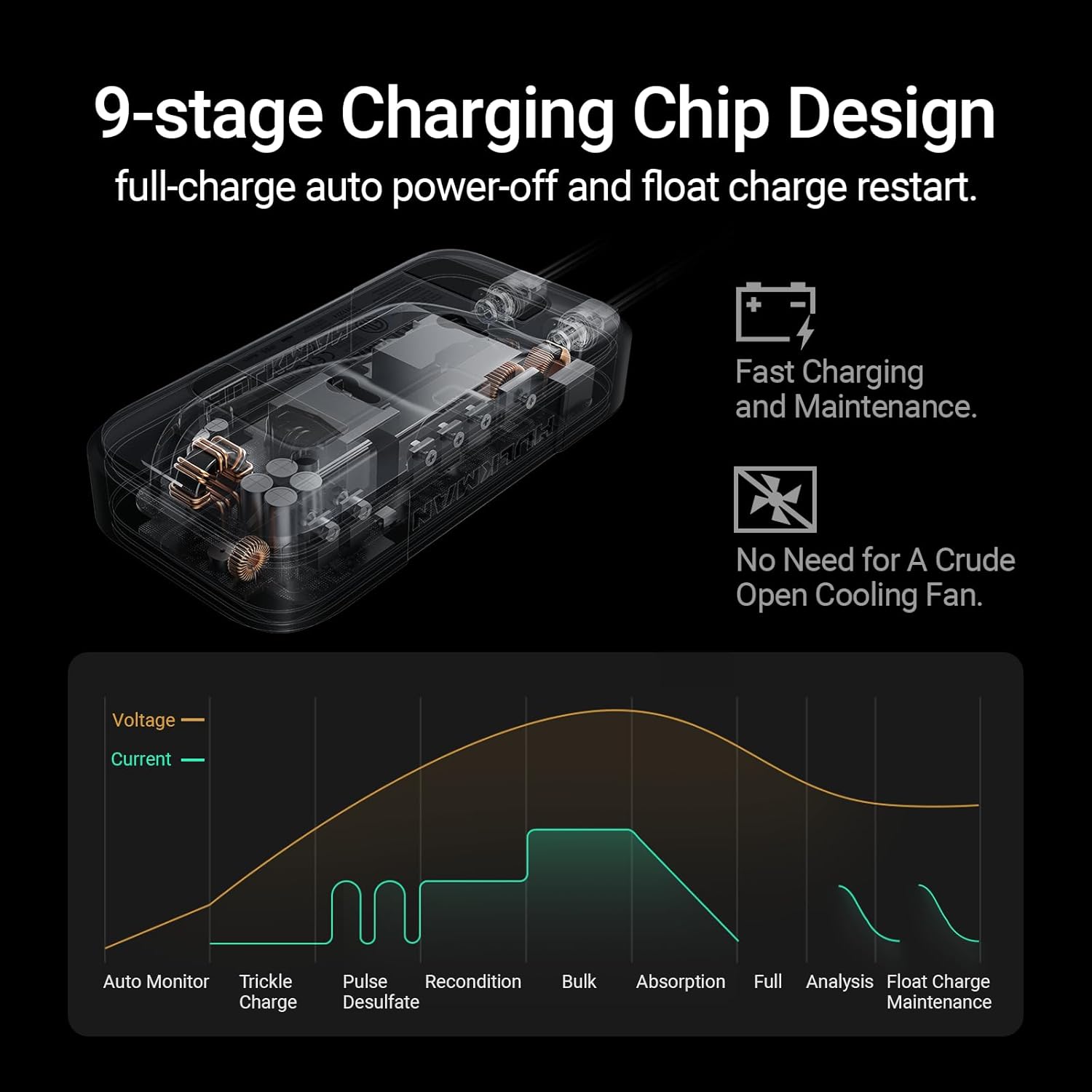- 9 Stages Battery Maintainer — No need to worry about overcharging or overheating. With a smart chip, it optimizes car batteries by 9-stages charging. This tech enables full charge auto power-off and float charge restart, keeping the battery in peak condition without intervention