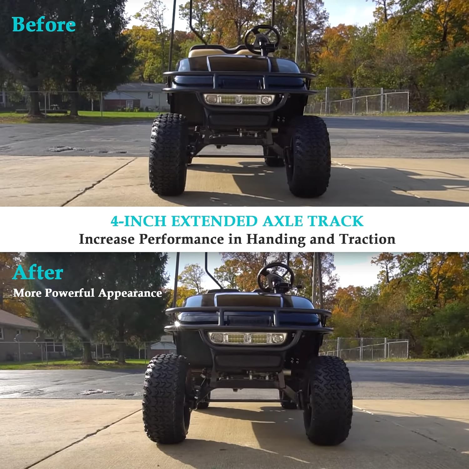 - 2 Inch wheel spacers for EZGO, Club Car & Yamaha golf cart, add 4 inches to the wheel axle track to allow for larger, wider or higher traction tires/rims/wheels and a more aggressive look