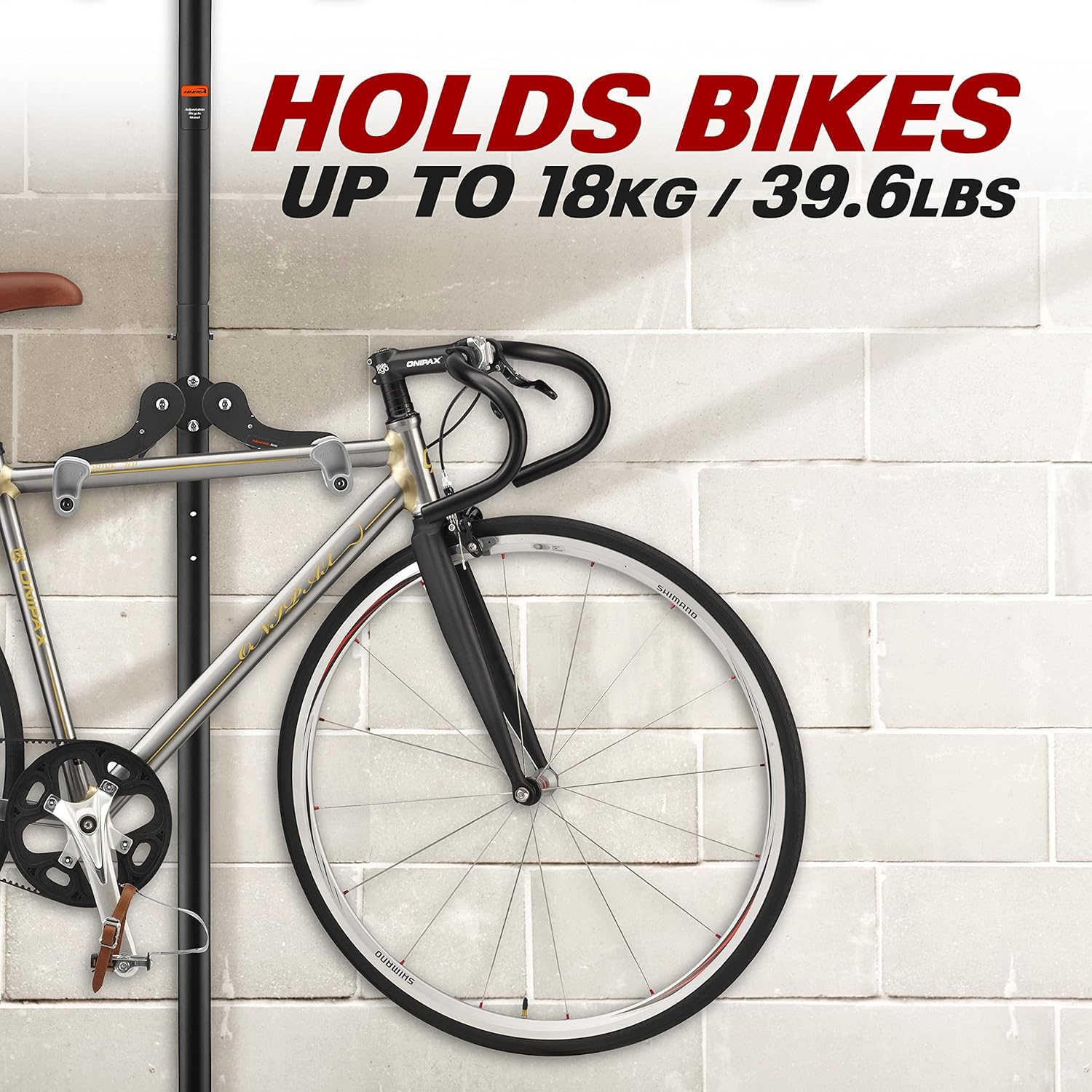 - FITS ALL FRAME TYPES: Length-adjustable arm and movable frame holder adapt to wider or narrower frames - this garage bike rack holds bikes up to 18 kg (39.6 lbs) securely and stably.