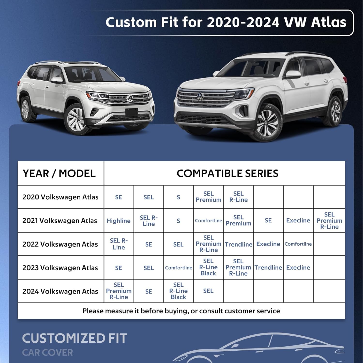 - ăPerfect Fităâ Holthly has conducted experiments to obtain a customized car cover specifically designed for Volkswagen Atlas (2017-2024). The custom-like fit of the full cover not only enhances the -aesthetics of your vehicle but also provides superior wind resistance, thereby prolonging the lifespan of the hood. It offers enhanced and long-lasting protection for your car.