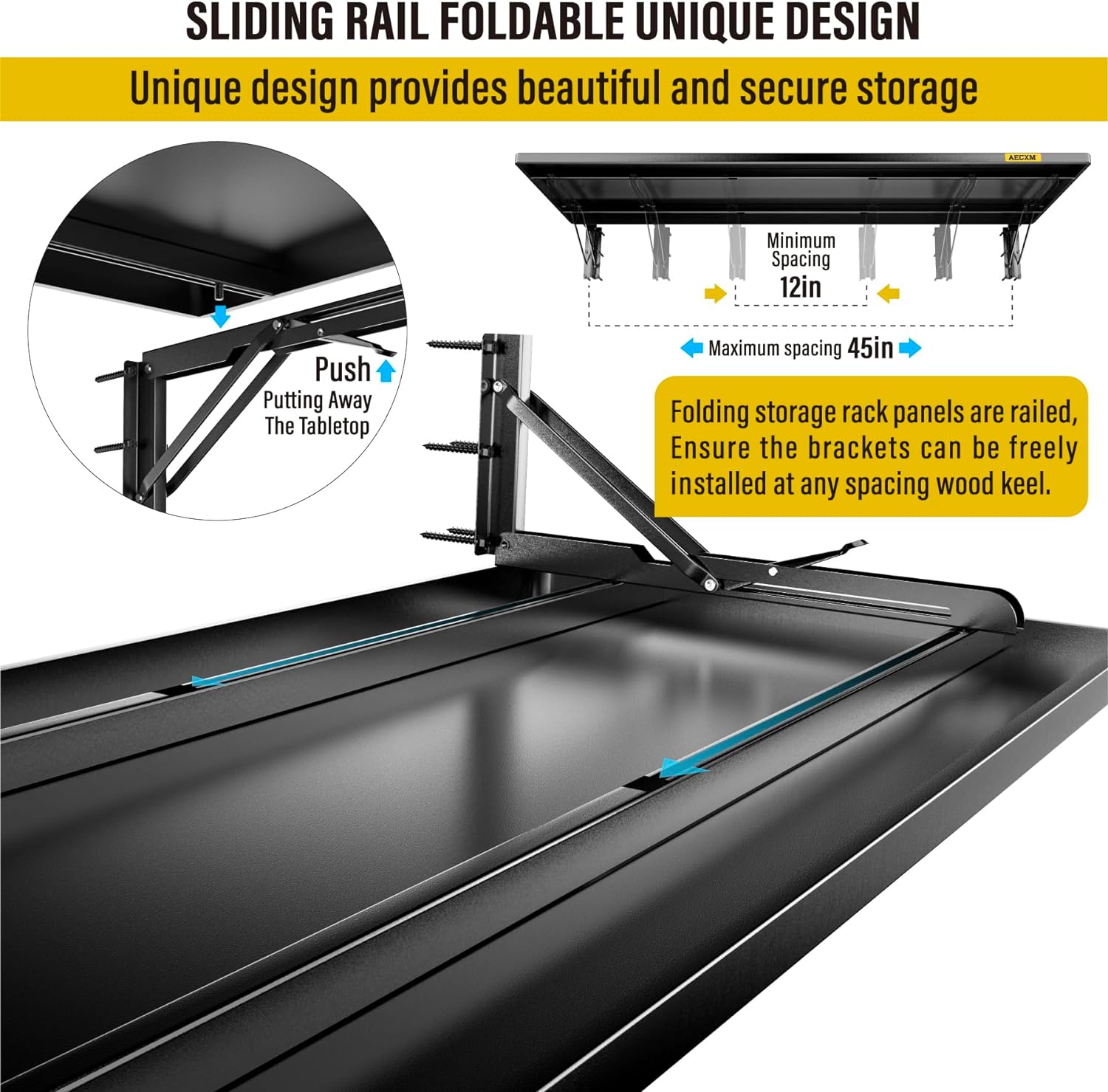 - SUPERIOR DESIGN: The foldable garage storage shelf panel is made of whole steel plate, The surface of matte high temperature powder baking paint, Flat and smooth, Panel with sliding rail design, The bracket can be installed freely in the range of 12"-45" spacing of wood wall keel, And at the same time it adopts folding bracket, Which can be freely stowed away or unfolded