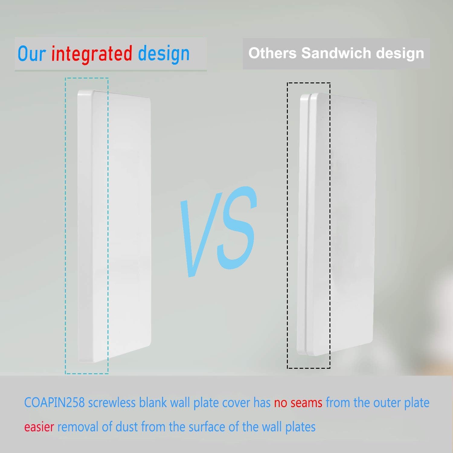 - 【Safe and High Quality】COAPIN258 blank wall plate cover is no visible screw design for child safety. Fire resistant material with no fire hazard. Switch Outlet cover is made of durable unbreakable polycarbonate thermoplastic, blank outlet cover is flexible and resilient which can withstand bends, twists, hard impacts and heavy force, light switch cover plate heat resistant to temperatures over 100°F to protect against discoloration and fading over time.
