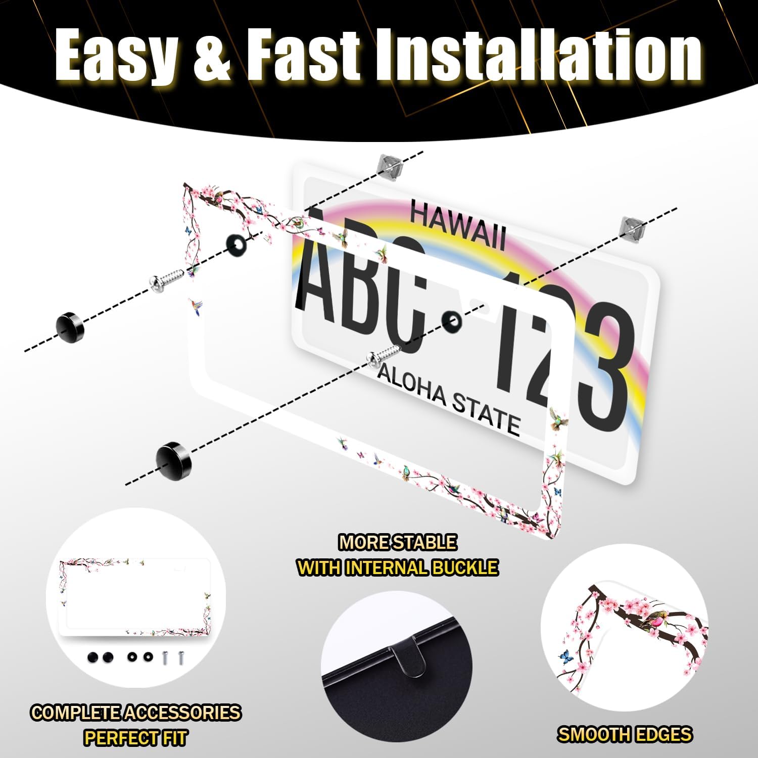 Hummingbird License Plate Frame Cherry Blossom Pink Flower License Plate Holder Colorful License Plate for Car Decoration Stainless Steel Bird Car Accessories with Screws Women 12.3"x6.3"