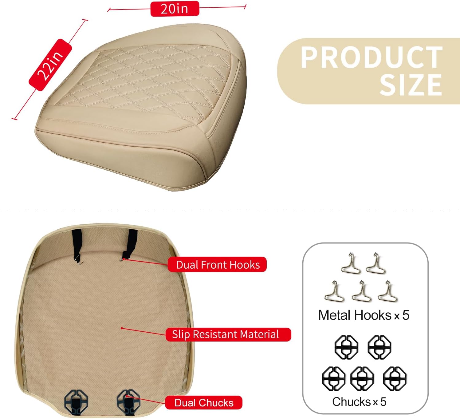 - Keep in place and easy to install: This front car seat cover has a non-slip gel bottom, with chucks and hooks to keep it in place well. It's also easy to install, insert the chucks into the gap between the seat back and the bottom, attach the hook under the seat bottom, then use the buckle to fasten the long elastic strap to the seat back, you can easily finish it in about 5 minutes Install.