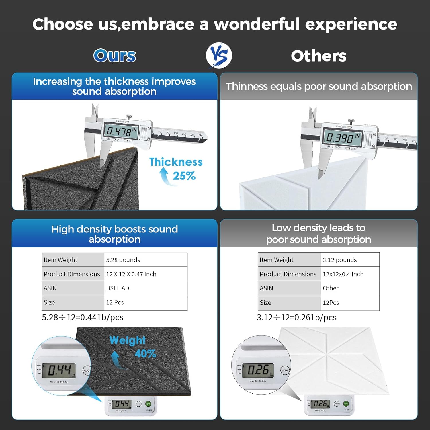 - 【Excellent Quality】: This wall soundproofing foam board is made of high-quality 100% polyester, odorless and flame retardant. There are no risks associated with spending long periods of time in a room with acoustic foam panels. And compared with traditional sound-absorbing panels, our products have higher thickness (25% thicker) and density (35% denser), which means better durability and stability, and will not be easily deformed after long-term use.