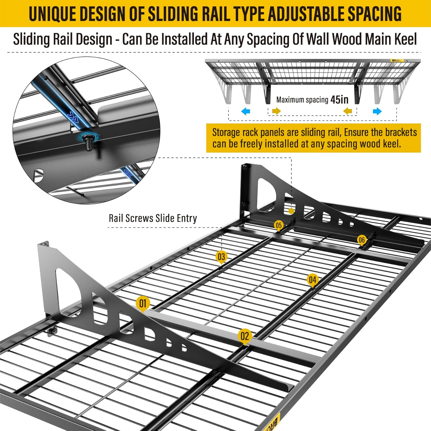 - KIT INCLUDES:Includes 1pc-Grid Shelf; 2pc-Brackets; 6pc-Hexagonal screws (Hardened ∅0.2" L/2"); 4Sets-Rail attachment bolts; 1pc- Drill bit; 1pc-Socket; 1pc-installation manual. All hardware of Brukid Professional Series Wall Mounted Shelf are under strict quality control and testing, We strive to provide our customers with a quality shopping experience, If you have any questions, Please feel free to contact us