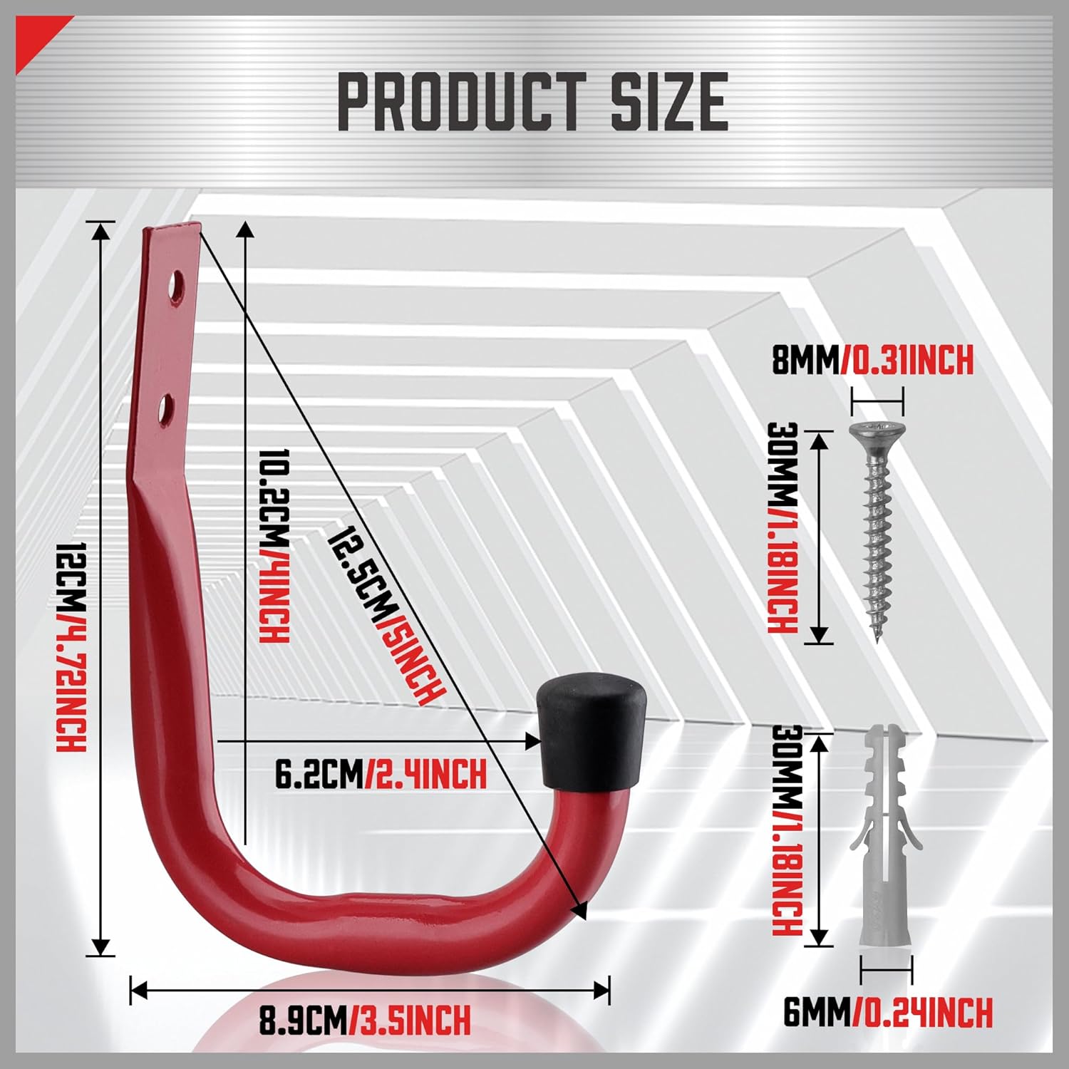 - 6 pack garage storage hooks with 12pcs screws and anchors, hook size: 4.72in x 3.5in(L x W).