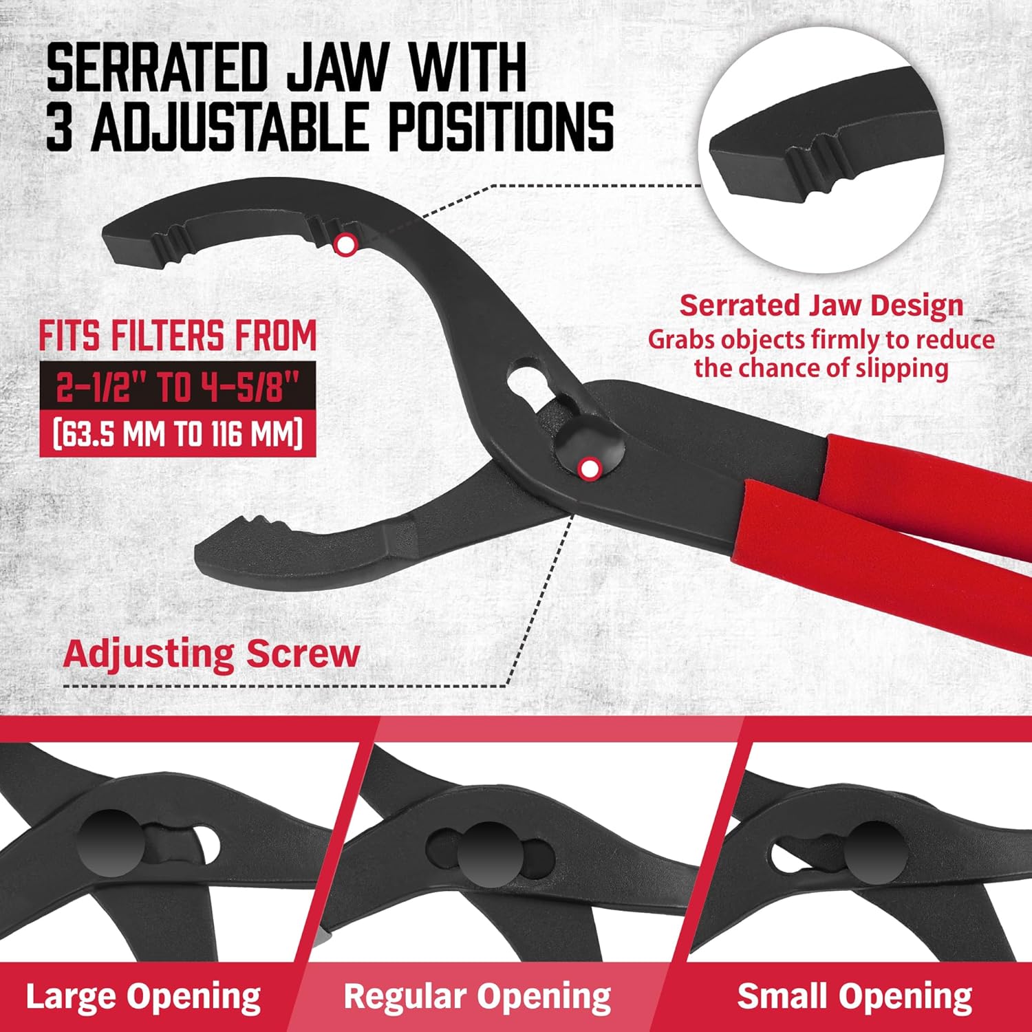 - [Professional Tools]: 12" Adjustable Oil Filter Pliers, Soft, non slip handles provide extra stretch and leverage in narrow areas.