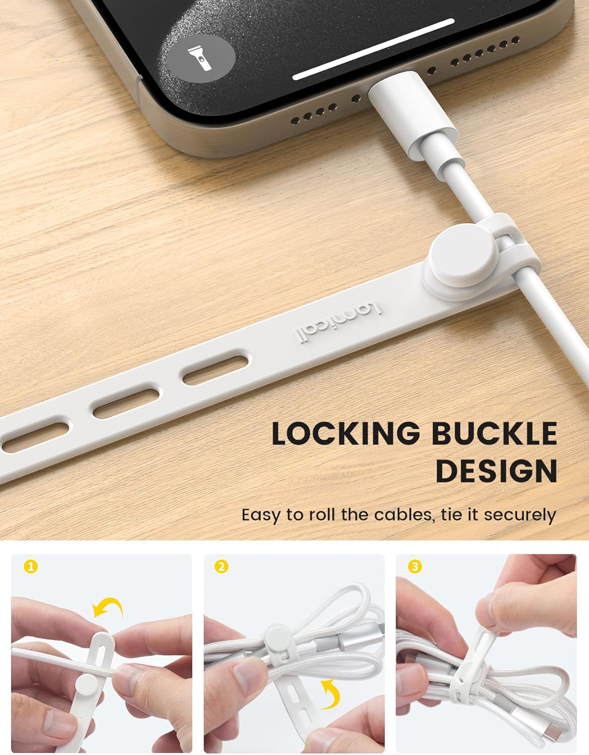 - Organization & Portable : These cord organizer cable ties are designed with easy and secure installation in mind, allowing you to quickly organize your cables without any hassle. Just put your cables into the button position, lock and roll it. Say goodbye to the tangled headphones or messy cables in your bag. Save your storage space while on-the-go