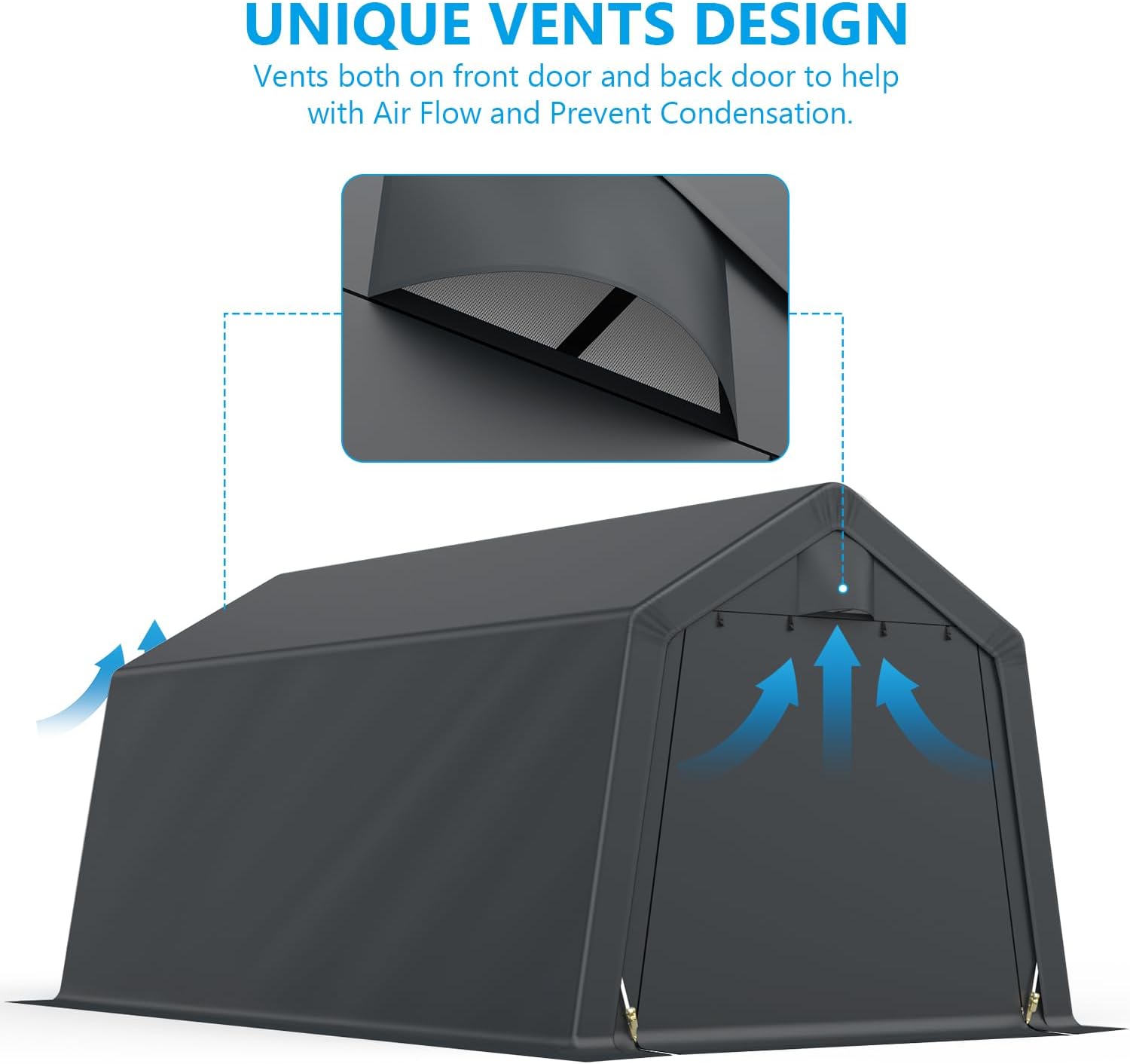 - Roll-up Door with Zipper: The storage shelter small carport with roll-up doors allows easy access for storing things and also provides excellent ventilation.