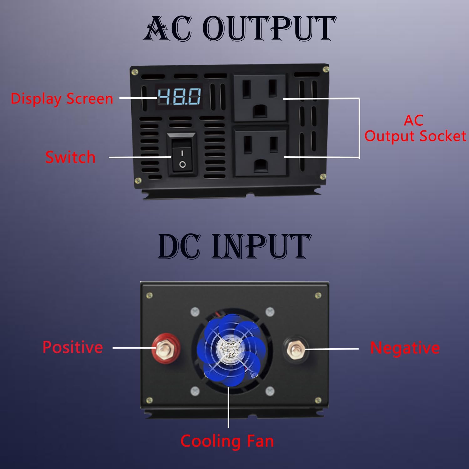 - pure sine wave inverter:Smooth and perfect sine waveform, just the same as home power/city power, Provide max 1200 watt continuous power and 2400 watt peak power at 60Hz frequency, power your 110v 120v ac appliance with a 36v power battery bank (battery voltage 30v to 48v is acceptable)
