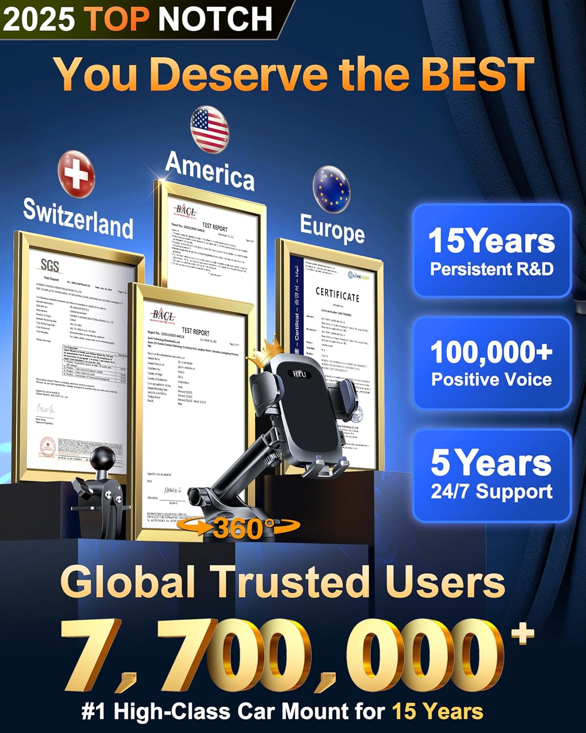 HTU 2025 Best Car Phone Holder 【Ultimate 5-in-1 & Upgraded 100+LBS Strongest Suction】【True Military-Grade & Safety Cert】 360° Windshield Dashboard Vent Mount for iPhone Android & Truck, Deep Black