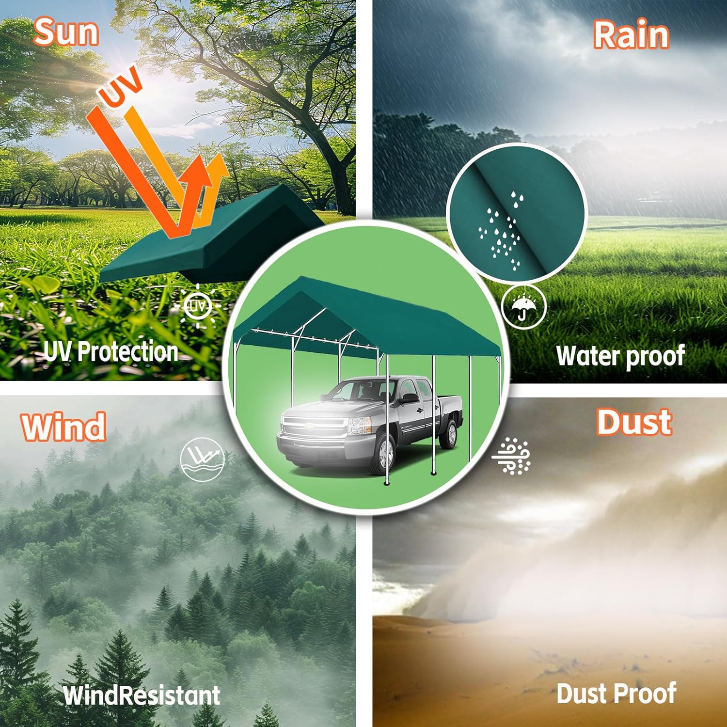 - 【WATERPROOF CANOPY COVER Only】- This Top replacement Roof Cover is Made of Heat-sealed Polyethylene Fabric, which is Anti-UV, Waterproof and Can Protect Your Car or Vehicles against Dust, Sun, Wind, Rain and Snow. FRAME NOT INCLUDED