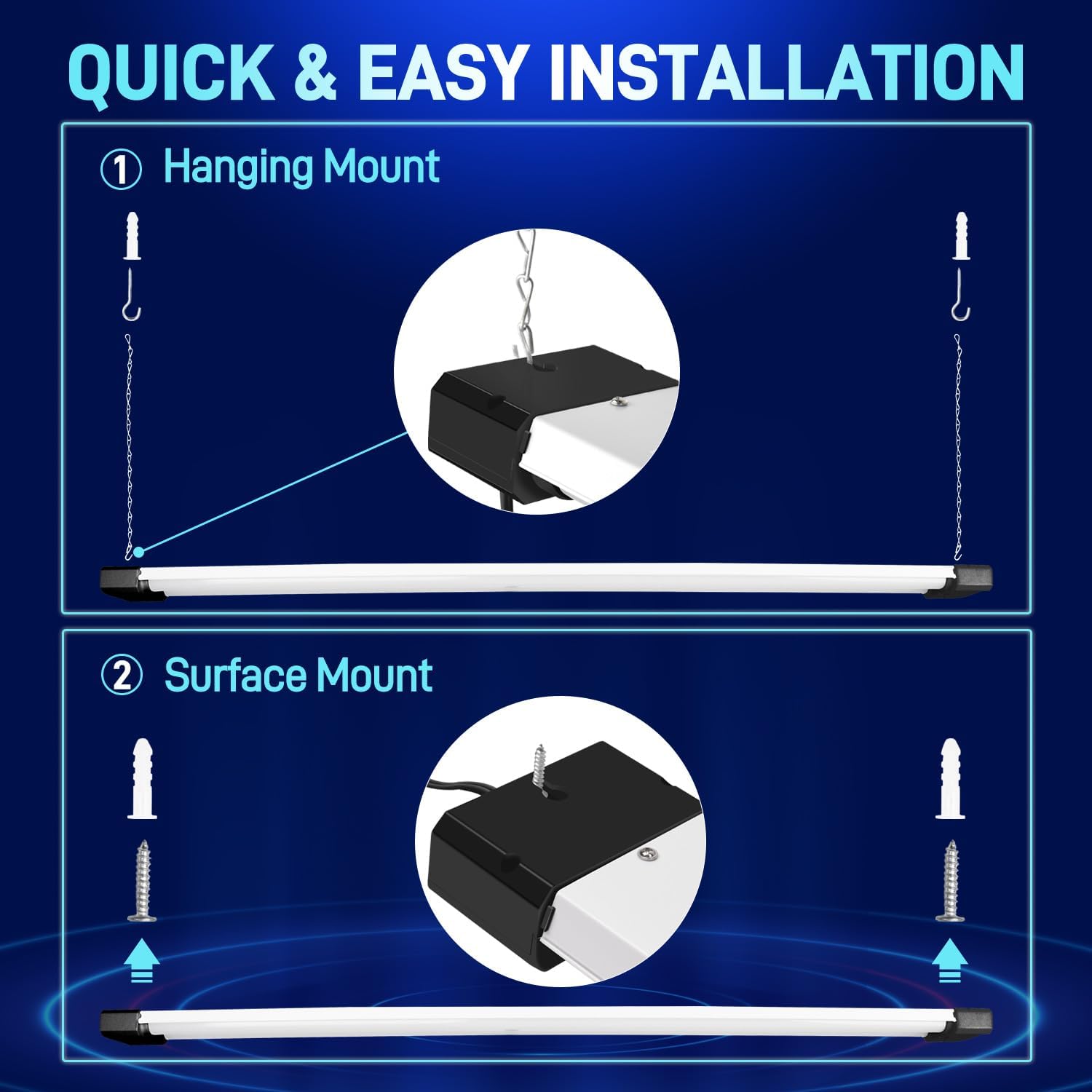 - ā Easy Installation - Plug & Play. Come with 59" power cord with on/off switch and other small accessories. You can hanging it with the included hanging chains or directly mounted to the ceiling with the included mounting screws.