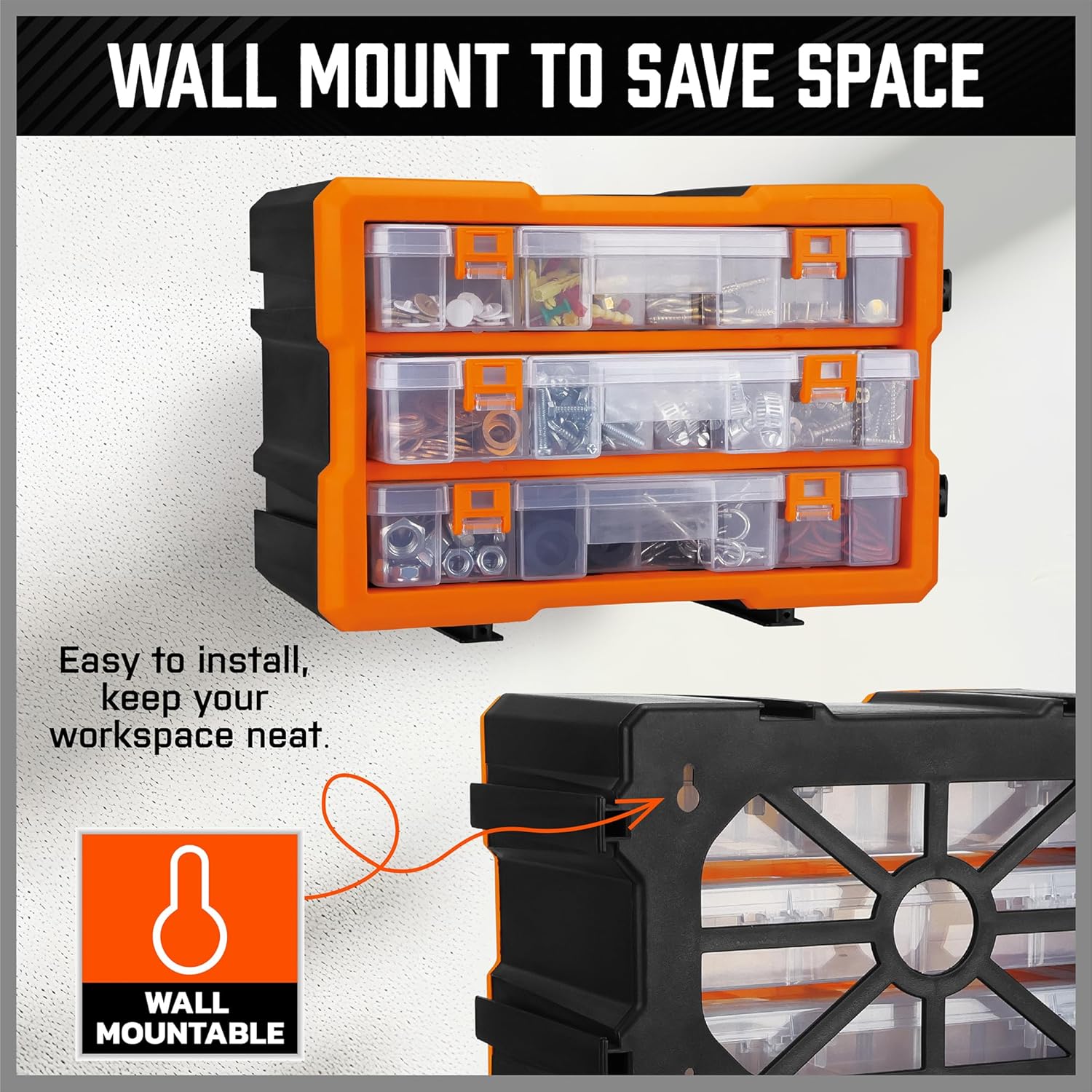 HORUSDY 38-Drawer Durable Screw Organizer, Small Parts Organizer for Hardware, Tools, Screws, Heavy-Duty Wall Cabinet Storage of Beads, Crafts (3 Large Drawers with Dividers for 36 Compartments)