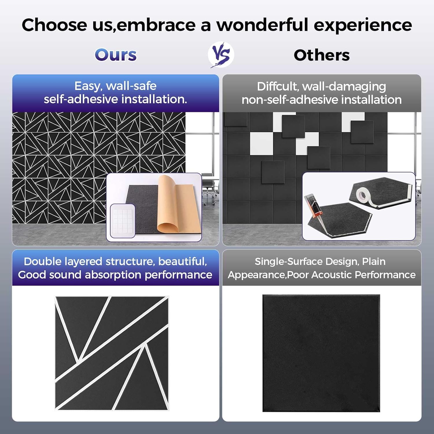 - Widely Applicable: Acoustic panels self adhesive size: 12" x 12" x 0.43", and the thickness is 8% thicker than the traditional thickness, it can provide more effective noise blocking and is suitable for a variety of high-demand environments. Suitable for home theaters, professional studios, music rooms, It can effectively improve the audio effect and enhance the work and entertainment experience in various places such as game rooms, bedrooms, offices, etc.Beautifully packaged, it is also a wonderful gift