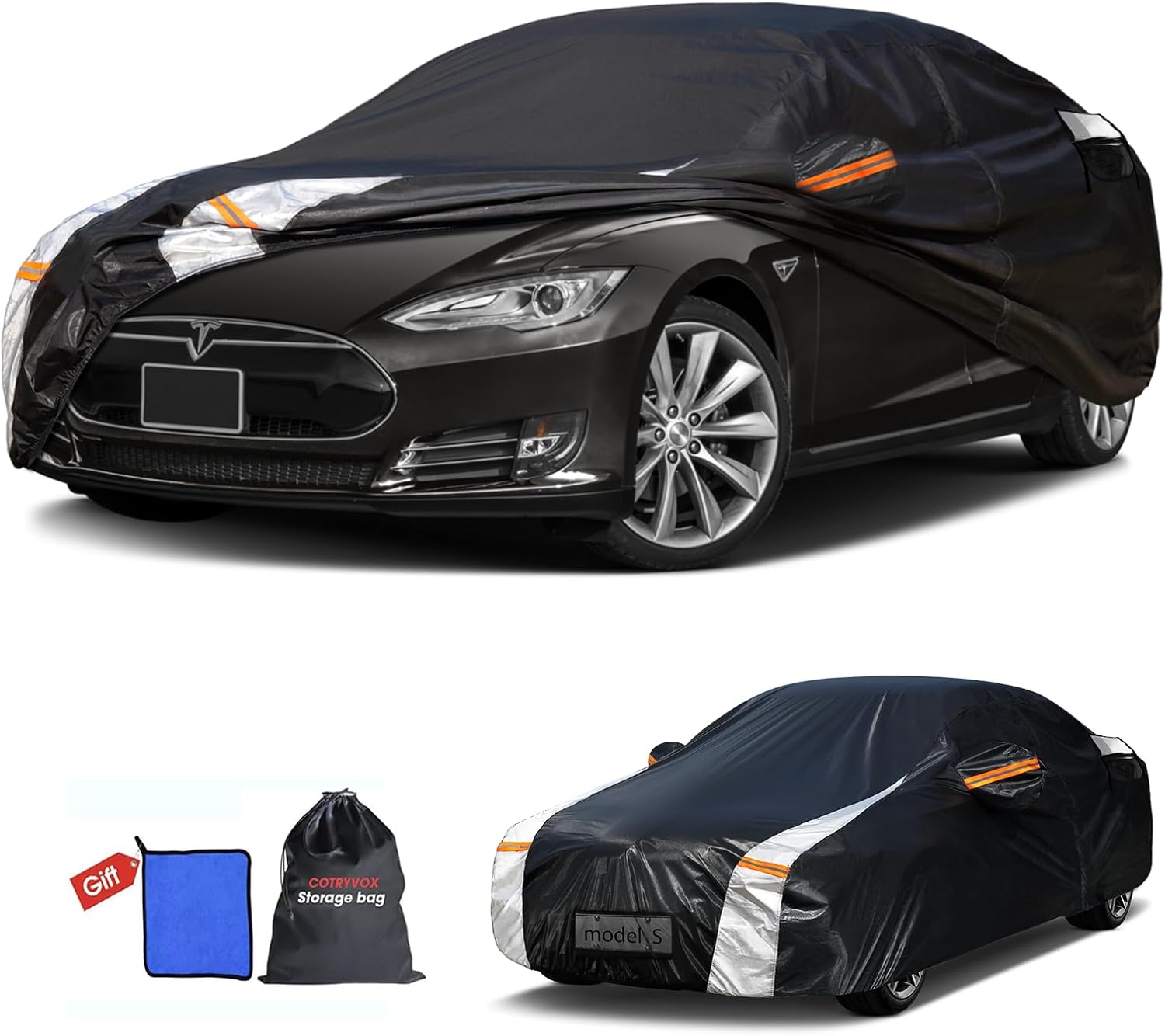 12-Layer Custom Fit Car Cover for Tesla Model S (2012-2025), Upgraded Waterproof All-Weather Full Exterior Cover with Door Zipper and Charging Port, for Snow Rain Dust and Sun UV Protection-Black.