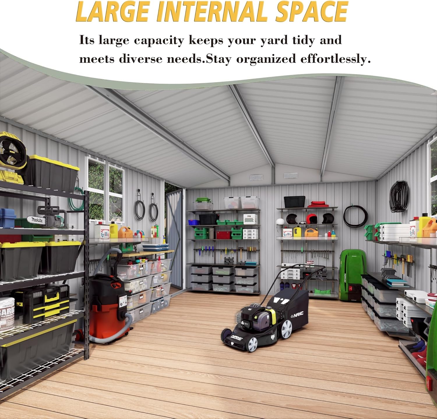 - LARGE STORAGE SHED: Measuring 115.75''L x 169.29''W x 80.31''H. Vigo huseeo shed offers a generous amount of storage room for various items such as gardening tools, outdoor sports gear, and seasonal items. Its large capacity keeps your yard tidy and meets diverse needs.