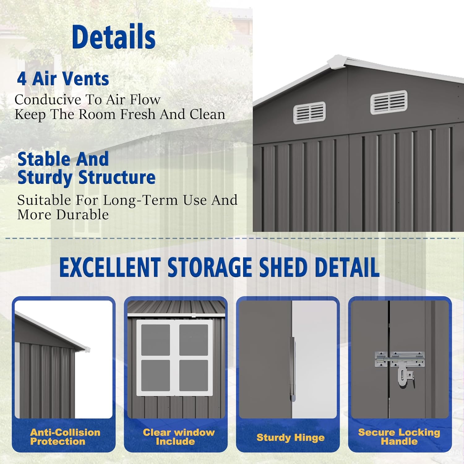 - Lockable Doors & Clear Windows - Keep important tools locked away; a lockable latch on double doors makes the metal garden shed an extra secure option for outdoor storage. Enjoy a shed that's an accent. Not only does our tool storage shed include vent windows, but natural light via a cottage-style window as well.