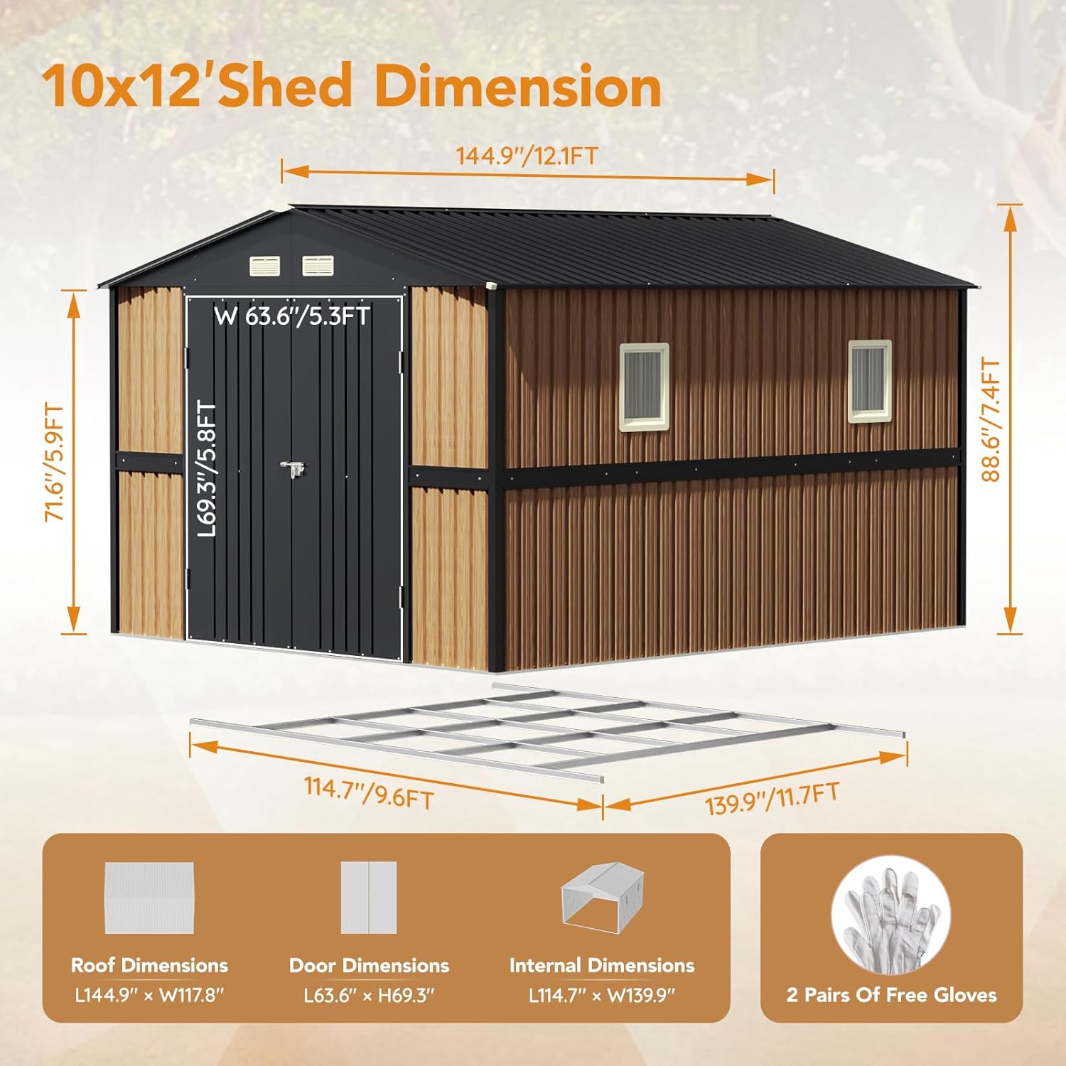 - [Large Size with Maximum Storage]The actual dimensions of our 10x12 FT tool shed are 9.6 x 11.7 FT (115 x 140 Inch), providing ample space for your garden tools and outdoor equipment. While named for convenience, the precise measurements are detailed in the product image for your reference. Scientific Height -Max height is 88.6'' ,which for most people can stand inside.The shed is equipped with a frame floor, so you don't need to purchase one additionally.