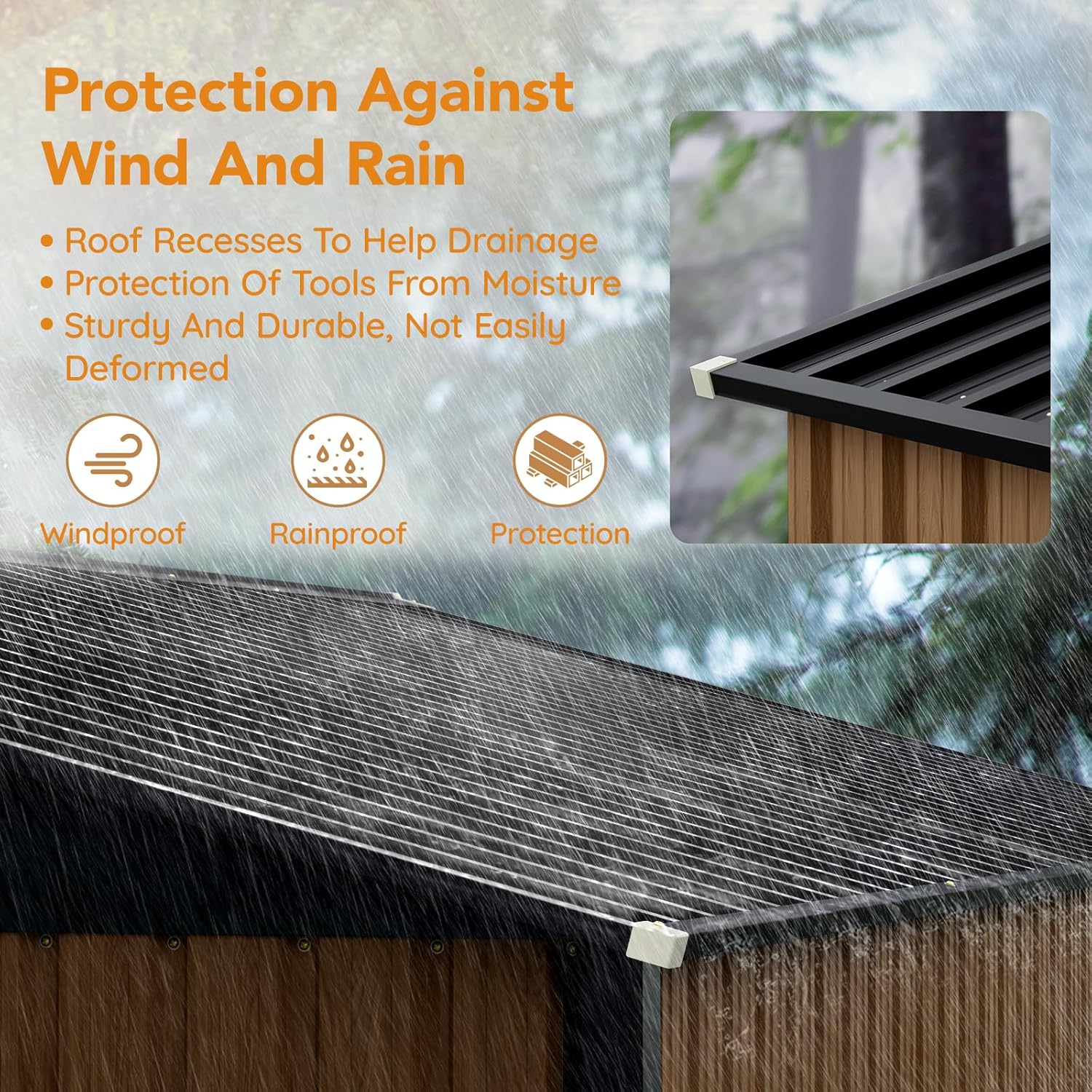 - [Scientific Design] Panovue storage shed has lockable door which provides security, keeps your tools away from being stolen, and avoids small animals from entering accidently. The sloping roof of this outdoor storage shed gives extra storage space while also preventing the rainwater accumulation and rusting. Enjoy superior access with a broad door entrance, designed for your ease in moving items in and out with convenience.