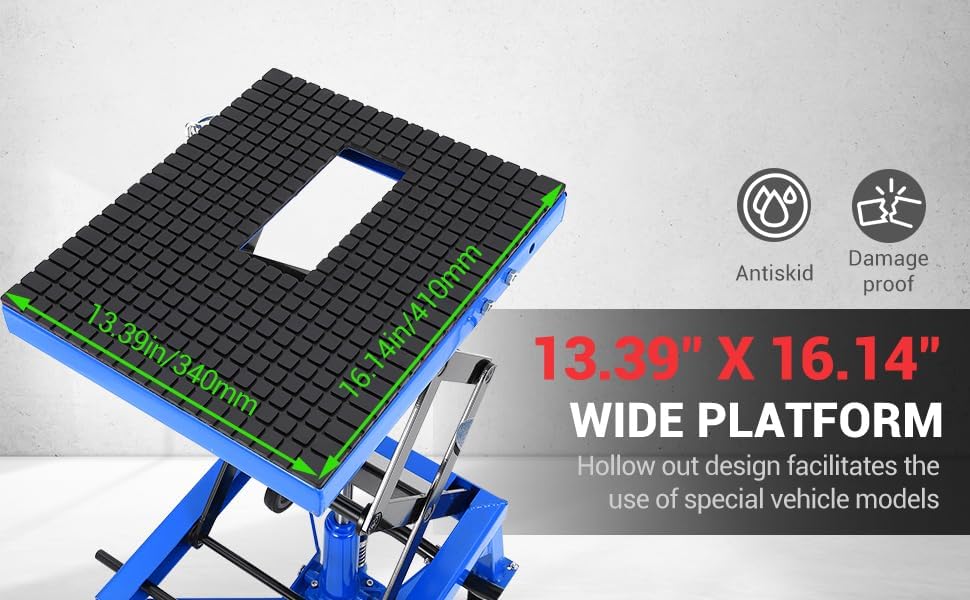 - Exceptional Safety with Heavy-Duty Construction β 350 lbs Capacity & Solid Steel Frame: High-strength worm gear transmission and scissor structure ensure secure lifting for motorcycles, ATVs, and dirt bikes. β Safety Pin & J-Hook: Prevents shaking or overturning during maintenance. Locking pole and bolt add double protection against accidental drops. β Anti-Slip Rubber Pad: Striped veins on the top surface protect your vehicle from scratches and slippage.